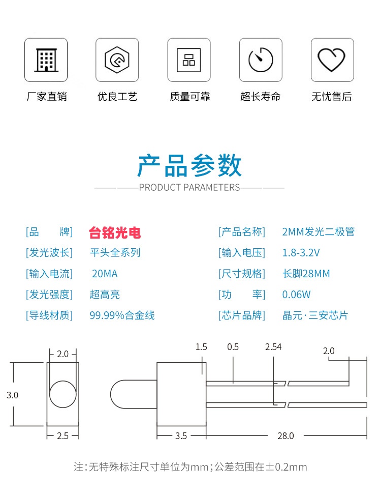 尺寸:直径2mm(F2规格,部分厂家标注为φ2mm)