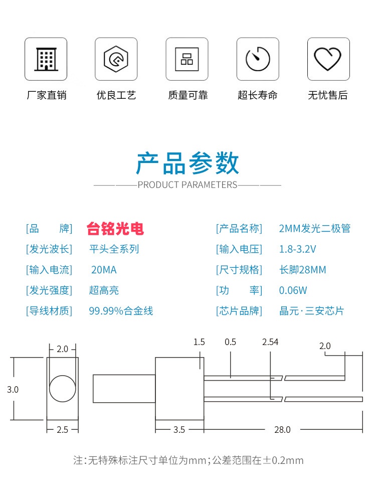 • 尺寸:直径2mm(F2规格,部分厂家标注为φ2mm)