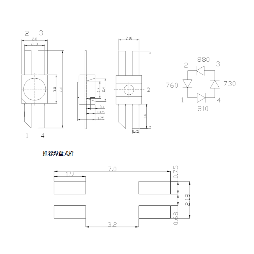 6028反贴片led 红光红外四芯灯珠脑部神经衰弱灯珠3528四脚反贴